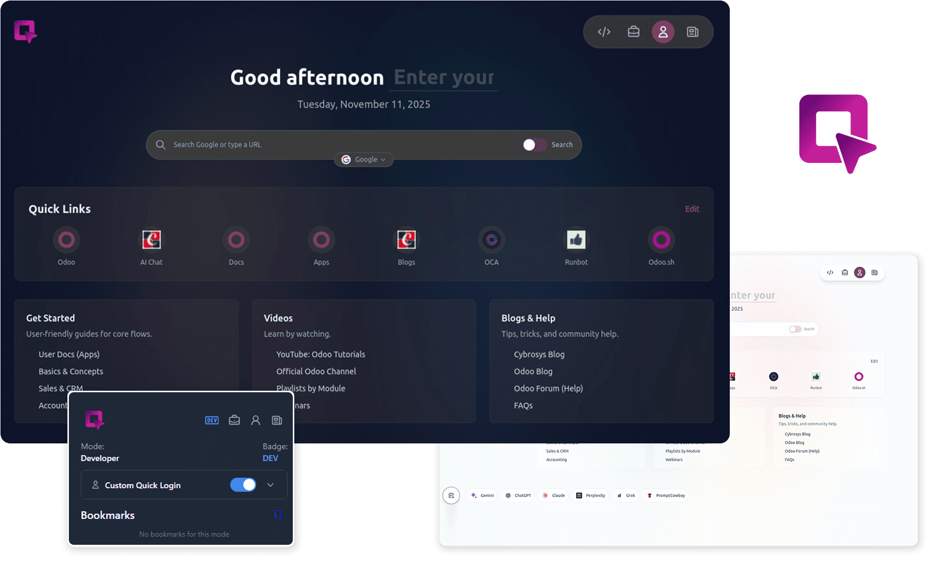 A beautiful new tab page designed for Odoo professionals. Streamline your workflow with smart mode switching, AI assistance, and quick access to everything you need.